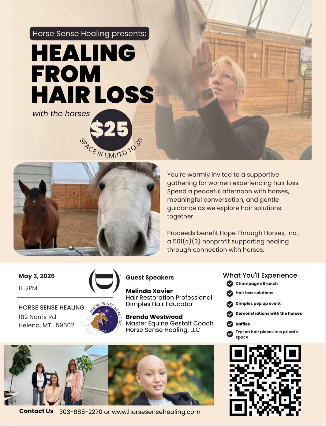 Brenda and the horses will share how horses and gestalt can help support you through the journey of hair loss. The Equine Gestalt Coaching Method offers powerful transformation and healing.
